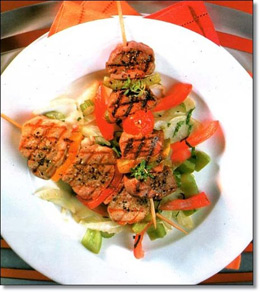 Retire la grasa visible de las carnes y corte en cubos. Lave las verduras. Corte la cebolla y los pimentones en cuadritos, retirando las semillas de éstos últimos. Sin pelar el zapallo italiano, córtelo por la mitad a lo largo, y luego píquelo en rodelas para formar medias lunas. Retire el tallo de los champiñones. Inserte en una brocheta un trozo de cada tipo de carne, alternando con las distintas verduras. Aliñe con sal y pimienta a gusto. Lleve a la parrilla hasta que las carnes estén cocidas. |